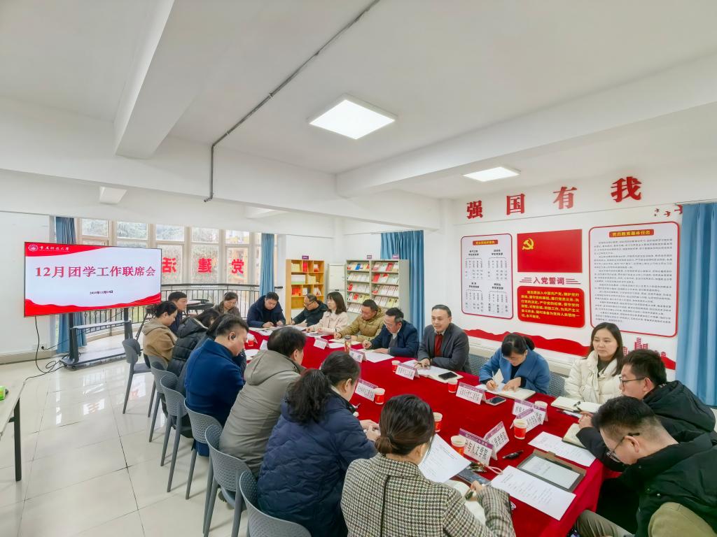 为深入贯彻落实立德树人根本任务,总结交流学生教育管理工作经验,精准研判当前工作面临的新形势新挑战,进一步提升思想政治工作质量,12月29日下午,学工党支部在容园二号“一站式”学生社区公寓B4113组织召开了学生工作专题会议暨2025-2026学年第一学期12月团学工作联席会。学校党委副书记谭勇出席会议并指导工作,党委学生工作部处级以上人员、各学院学生工作负责人、心理健康与咨询中心主任等参加会议。会议由学工党支部书记、党委学生工作部部长何亮主持。